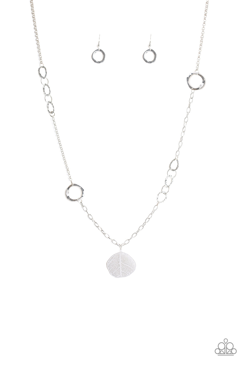 A collection of silver rings and asymmetrical hoops give way to a lifelike silver leaf pendant for a seasonal flair. Features an adjustable clasp closure.
