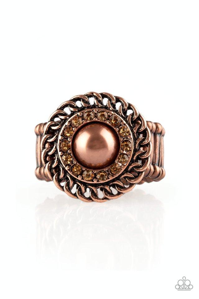Shimmery copper chain link spins around a ring of glittery topaz rhinestones, creating an edgy frame. A pearly copper bead is pressed into the center of the frame for a glamorous finish. Features a stretchy band for a flexible fit.