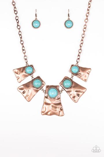 Rippling with hammered details, flared copper frames join below the collar, creating a fierce fringe. Refreshing turquoise stones are pressed into the tops of the frames for a colorful finish. Features an adjustable clasp closure.
