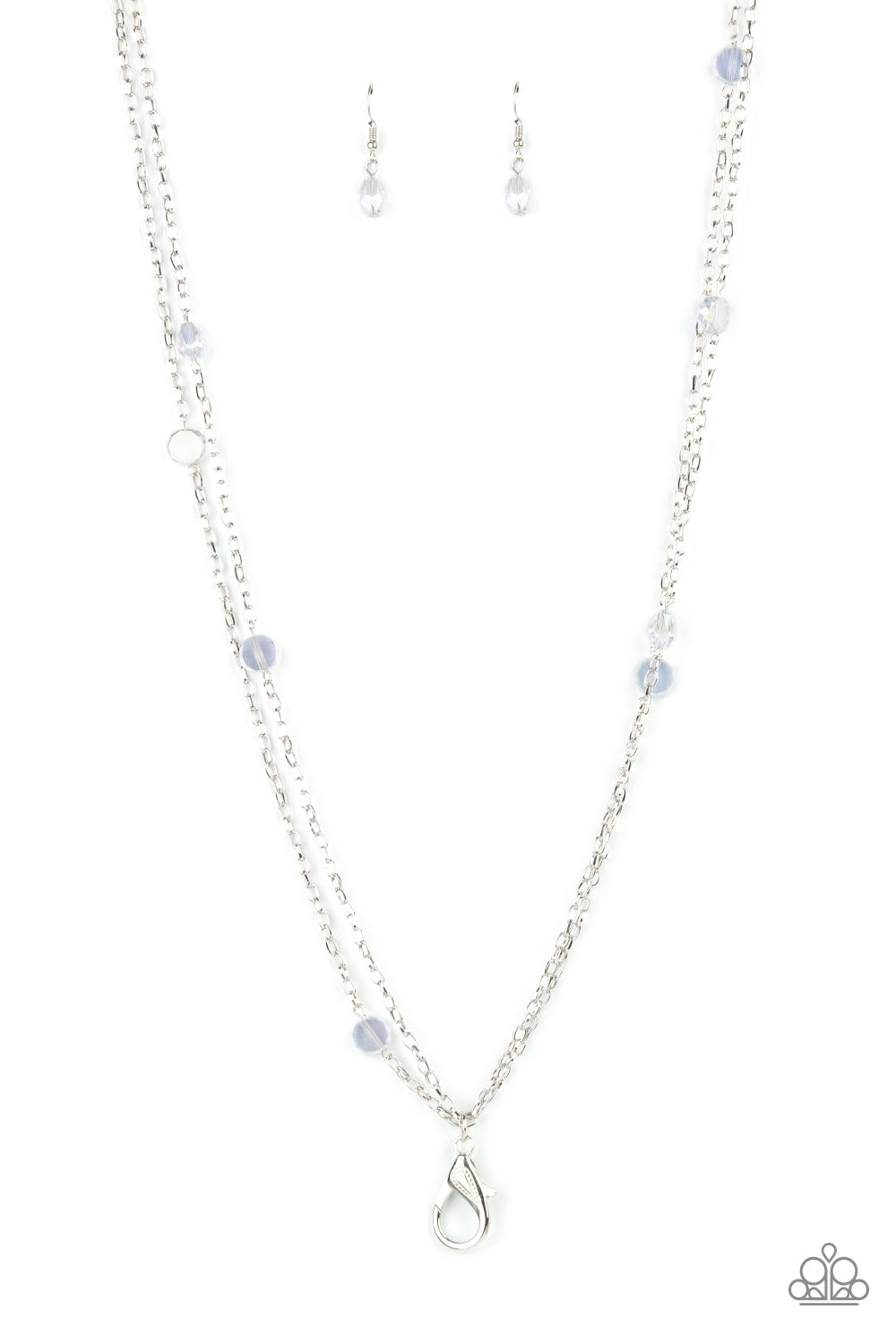 Dotted with glassy white iridescent accents, classic silver chains layer across the chest for a whimsically refined look. A lobster clasp hangs from the bottom of the design to allow a name badge or other item to be attached. Features an adjustable clasp closure.
