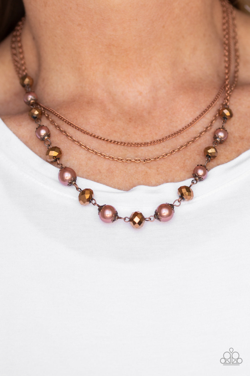 Infused with two layers of dainty copper chains, pearly copper beads and coppery aurum rhinestones link below the collar for a demure look. Features an adjustable clasp closure.